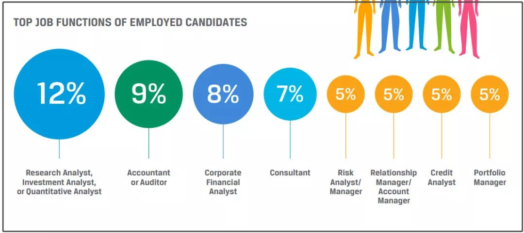 研究分析師、投資分析師、量化分析師——12%;會計、審計——9%;企業(yè)金融分析師——8%咨詢?nèi)藛T——7%;風險分析師/風險管理、投資關(guān)系經(jīng)理/客戶經(jīng)理、信貸分析師、投資組合經(jīng)理——5%;
