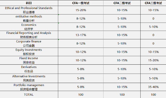 CFA考什么?首先一級科目,職業(yè)倫理道德、定量分析、經(jīng)濟學、財務報表分析、公司理財、權(quán)益投資、固定權(quán)益投資、衍生品、其他投資、投資組合管理。