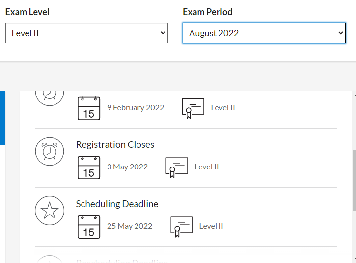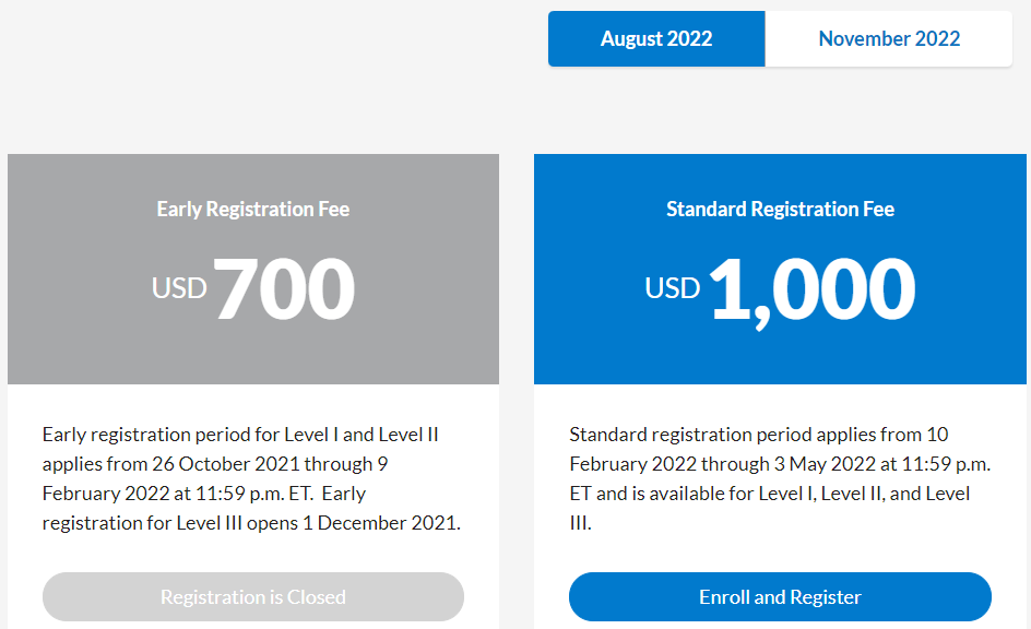 2022年8月考期三個級別的考試均有安排,下面是2022年8月CFA報名時間: