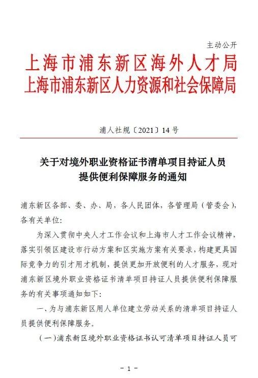 浦東新區(qū)海外人才局、浦東新區(qū)人力資源和社會保障局聯(lián)合發(fā)布了《浦東新區(qū)境外職業(yè)資格證書認可清單》和《浦東新區(qū)境外職業(yè)資格證書緊缺清單》,以及《對境外職業(yè)資格證書清單項目持證人員提供便利保障服務(wù)的通知》。