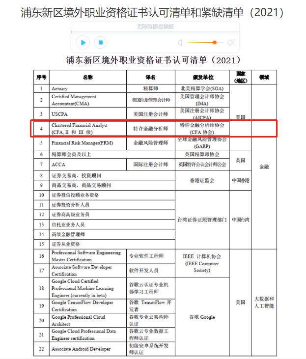 值得關(guān)注的是,CFA資格同時入選《浦東新區(qū)境外職業(yè)資格證書認可清單》和《浦東新區(qū)境外職業(yè)資格證書緊缺清單》金融領(lǐng)域類目。