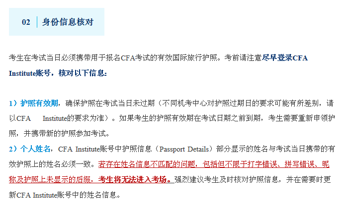 若存在姓名信息不匹配的問(wèn)題,包括但不限于打字錯(cuò)誤、拼寫(xiě)錯(cuò)誤、昵稱(chēng)及護(hù)照上未顯示的后綴,考生將無(wú)法進(jìn)入CFA考場(chǎng)。