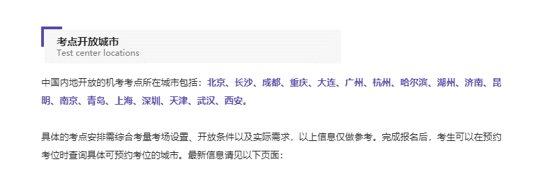 目前協會公布的2022年5月中國內地開放的機考考點所在城市包括:北京、長沙、成都、重慶、大連、廣州、杭州、哈爾濱、湖州、濟南、昆明、南京、青島、上海、深圳、天津、武漢、西安。