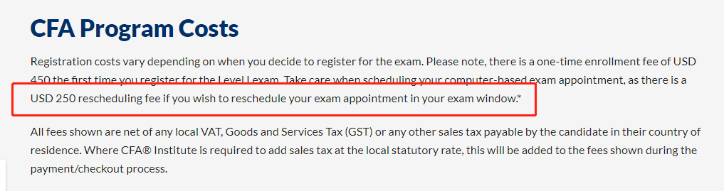 5月CFA延考后再次預約需支付$250
