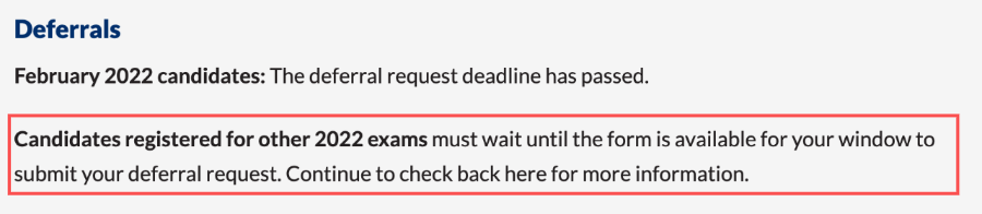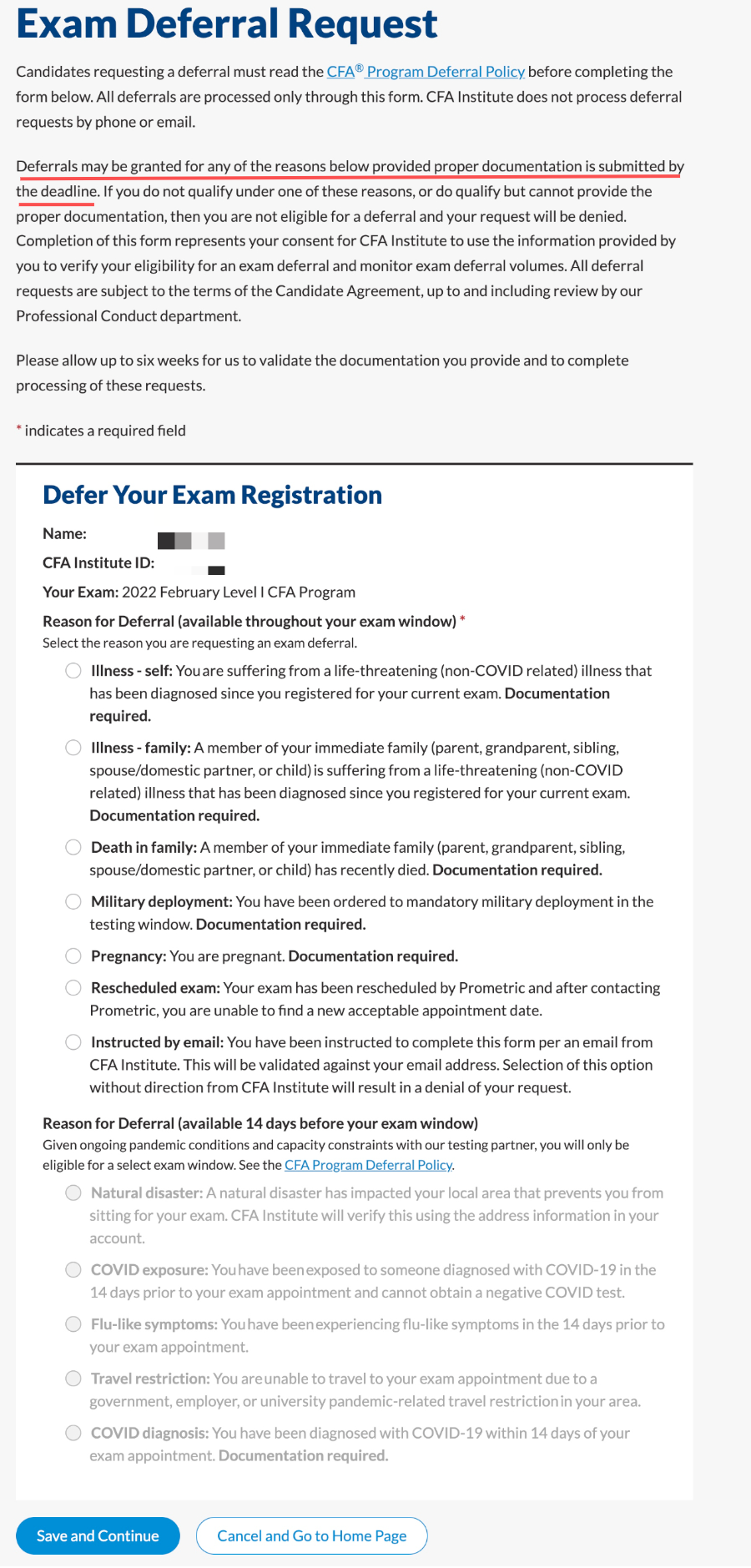 遺憾地告訴大家,目前還不能延期,針對5月CFA考試的延期通道目前還是關(guān)閉狀態(tài),所以無論你是什么原因,標(biāo)準(zhǔn)還是非標(biāo)準(zhǔn)延期,目前都無法提交申請。