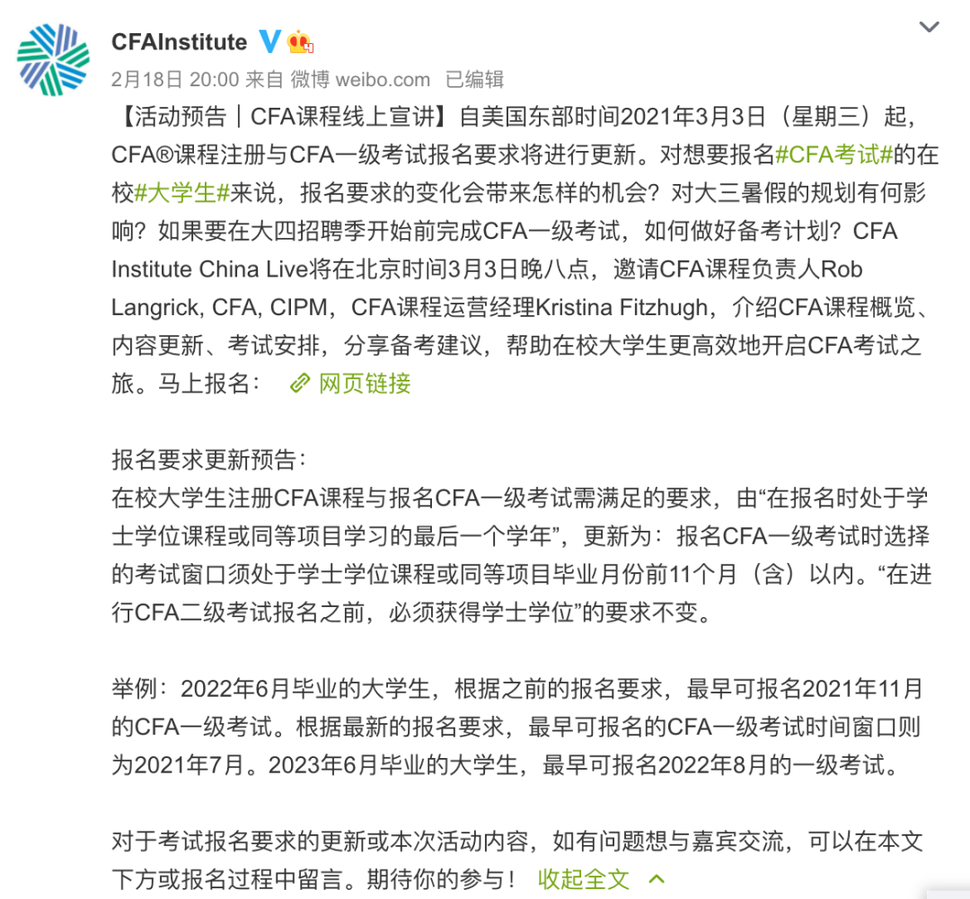 從官網(wǎng)通知來看,協(xié)會將調(diào)整在校大學(xué)生注冊CFA課程與報名CFA一級考試需滿足的要求。二三級考生不受影響。