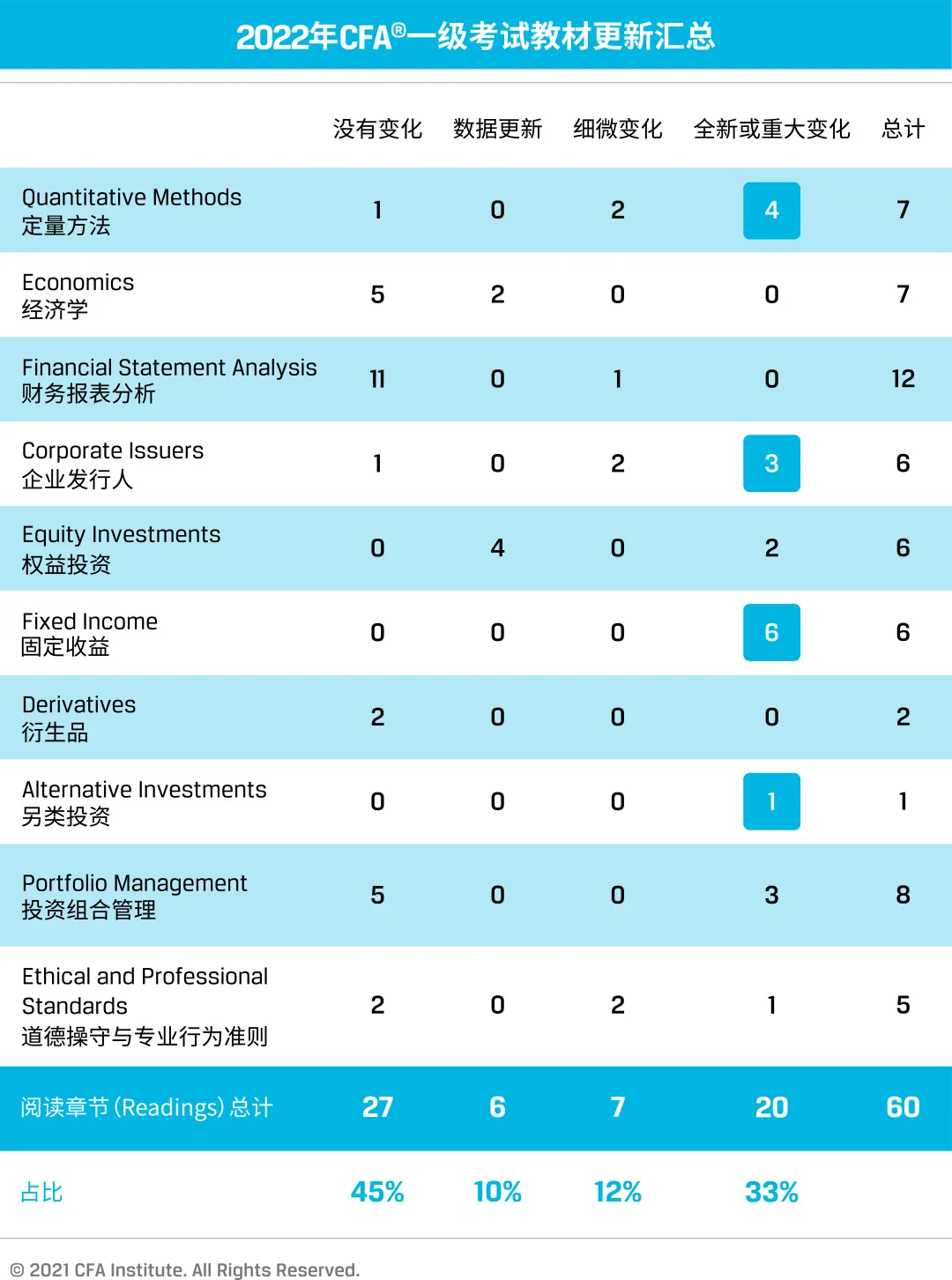 2022年CFA一級大部分科目的考綱都發(fā)生了變化,雖然Session總數(shù)保持19個不變,但Reading數(shù)由57增加至60個,其中,33%有新增內(nèi)容或重大變化,45%的內(nèi)容沒有變化,22%的內(nèi)容有細(xì)微變化或數(shù)據(jù)更新。