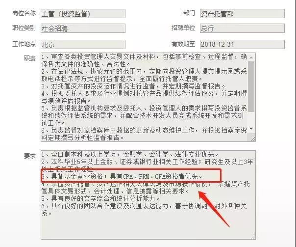 眾多銀行崗位任職條件中,有很多的銀行崗位明確指出FRM、CFA資格人才可以優(yōu)先考慮。五大銀行以及各大金融機構在風控領域,F(xiàn)RM和CFA®持證人就是香餑餑,一直都是如此,對于體制內的人來說,CFA考試和FRM對于一個人的升值是多么的重要!