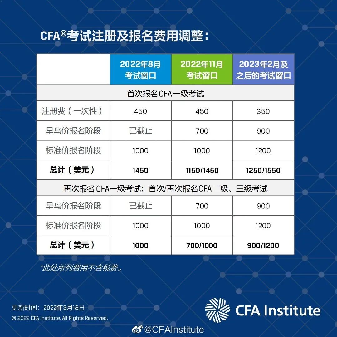 CFA Institute正式宣布,自2023年起,CFA(特許金融分析師)考試注冊和報名費用將進行如下調整: