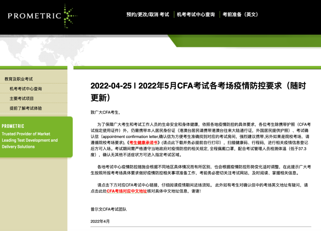 其實(shí)還有一個(gè)消息算是好消息了,每次考期開(kāi)考前,Prometric都會(huì)開(kāi)放一個(gè)“CFA防疫要求匯總頁(yè)”,是把各個(gè)地區(qū)考場(chǎng)的防疫要求匯總在一個(gè)頁(yè)面上。