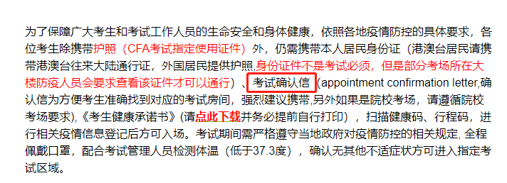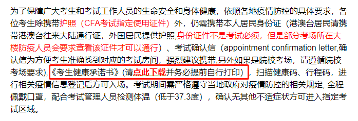 CFA協(xié)會也明確表示:根據(jù)各地疫情防控要求,考生需要在考試當(dāng)天攜帶有效身份證件、準(zhǔn)考信(選完考位后由Prometric發(fā)出的Confirmation Letter),掃描健康碼、行程碼,遵守當(dāng)?shù)卣畬π枰M(jìn)行隔離的相關(guān)規(guī)定。
