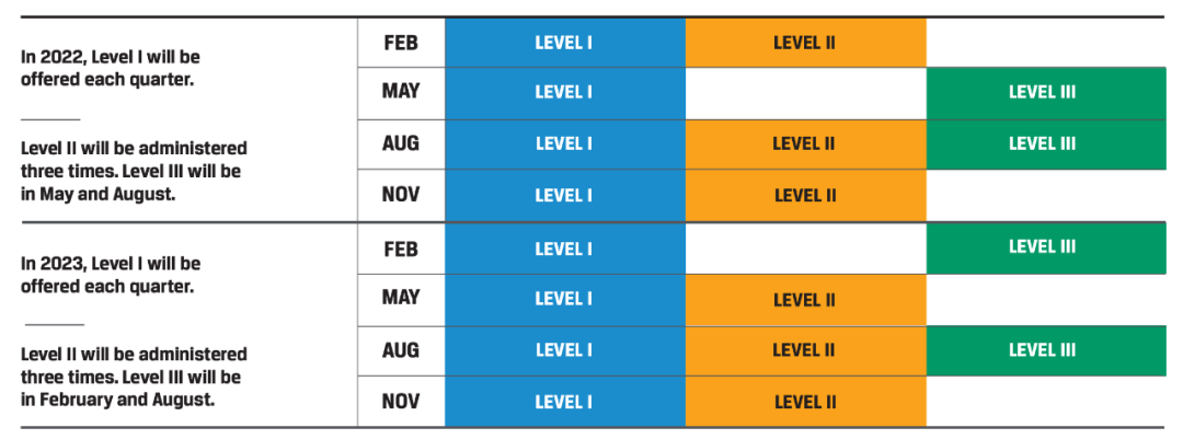 注意哈,CFA二級和三級的考期安排和今年是略有差異的,大家千萬要仔細。目前只有考期的大致安排,但是到底每個考期在什么時間考也就是CFA考試時間,協(xié)會還未公布,這個要等到開放報名的時候,才會有具體時間出來。
