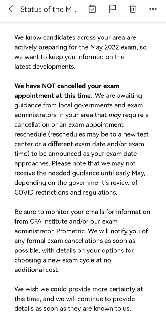 最近大家都只關(guān)心:5月CFA考試能不能考,那CFA協(xié)會(huì)也是終于發(fā)布了一封郵件,從官方角度來(lái)回應(yīng)大家關(guān)切的問(wèn)題,也讓我們一起來(lái)看一看。