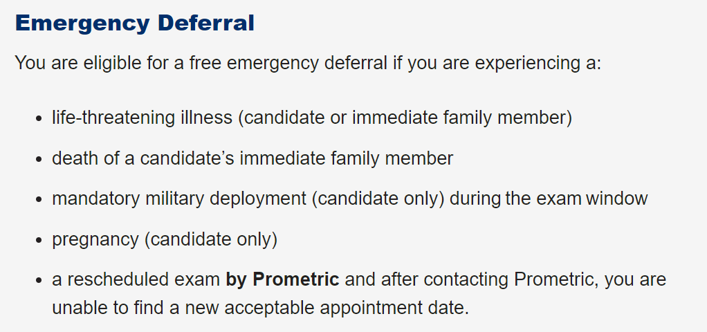 以上類型的考生必須要能提供證明文件,一旦延期得到批準和處理,可以將考試預約推遲12個月。