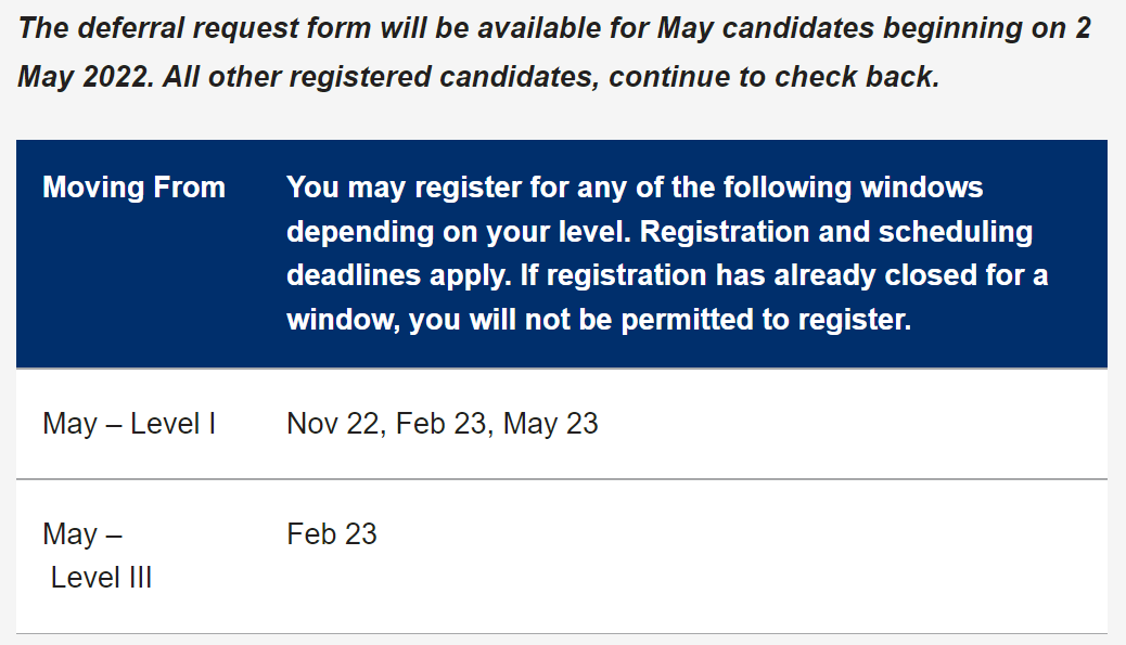 緊急延期僅通過特許金融分析師CFA協(xié)會延期表處理,CFA協(xié)會不通過電話或電子郵件處理延期請求。延期申請表將于2022年5月2日開始提供給5月份的候選人。