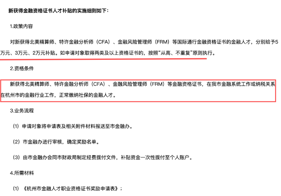 今天我們來看杭州,杭州也是廣納人才,特發(fā)了“錢塘金融人才”專項計劃,對新獲得特許金融分析師(CFA中國持證人)、金融風(fēng)險管理師(FRM)、北美精算師等國際通行金融資格證書的金融人才,給予最高每人5萬元補貼。(細則請看下圖)