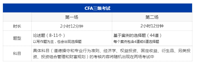 CFA三級(jí)考試的題型為基于案例的選擇題和寫作題,上下半場(chǎng)各2小時(shí)12分鐘。