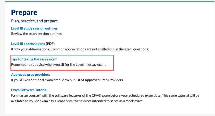 對于三級(jí)考生,寫作題一直是大家非常關(guān)注的,協(xié)會(huì)也是給考生提供了16-18年三年的上午真題,大家可以在prepare板塊選擇Tips for taking the essay exam下載。(具體可看下圖)》》》點(diǎn)擊領(lǐng)取CFA 考試全套真題題庫