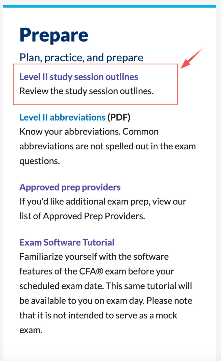 每次考試前,很多考生都會(huì)特別關(guān)心,學(xué)科占比是多少啊,考試大綱在哪里?。吭诠倬W(wǎng)也是有的,在Prepare板塊的Study session outlines可以獲取。