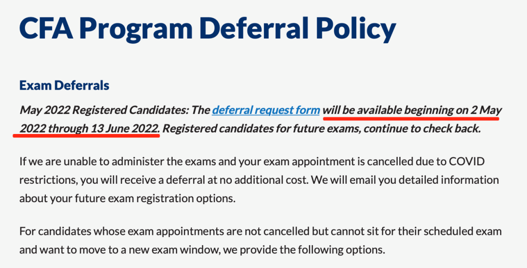 緊急延期僅通過(guò) CFA協(xié)會(huì)官網(wǎng)延期表格進(jìn)行處理。CFA Institute 不會(huì)通過(guò)電話或電子郵件處理延期申請(qǐng)。