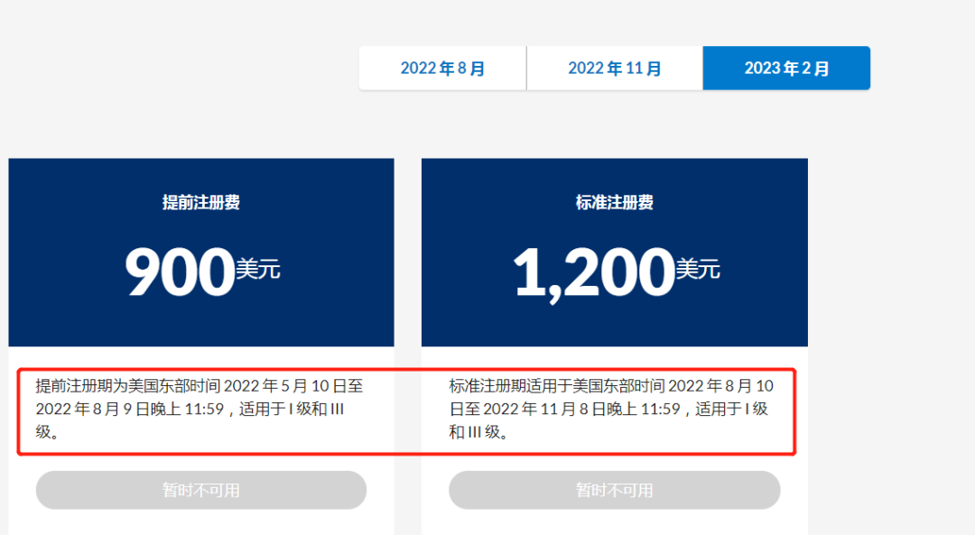 2023年2月CFA第一階段報名期限:2022年5月10日--2022年8月9日晚23:59分,需900美元。