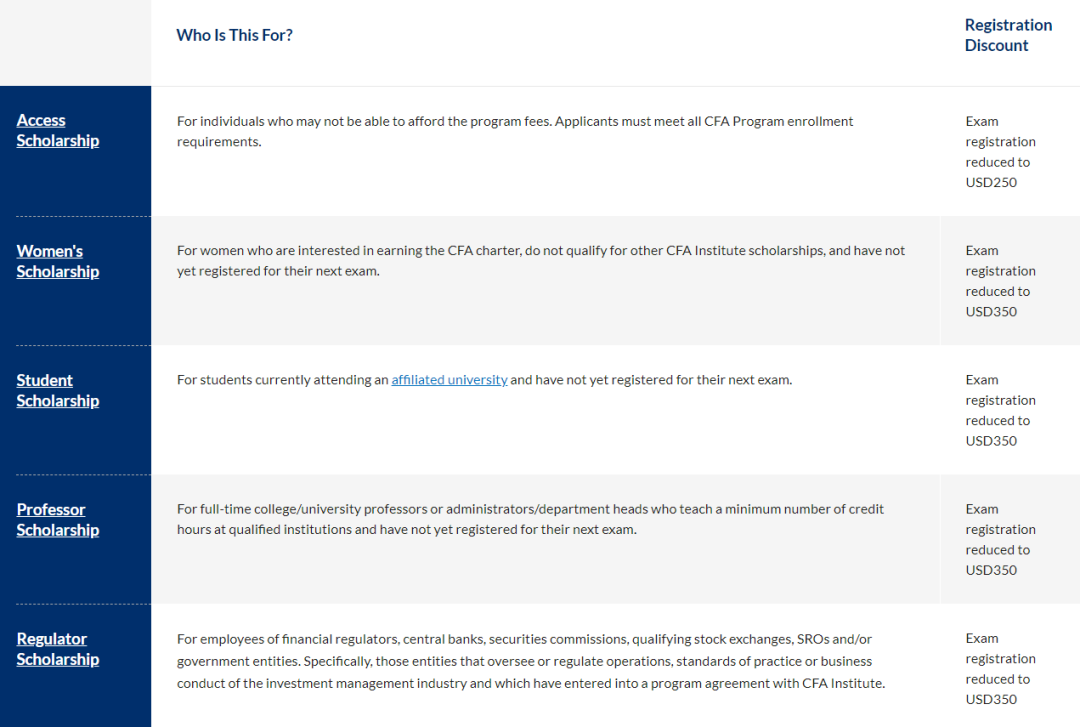 勵志獎學(xué)金(Access Scholarship):針對無法負擔CFA項目費用的個人,申請必須滿足所有CFA注冊條件。