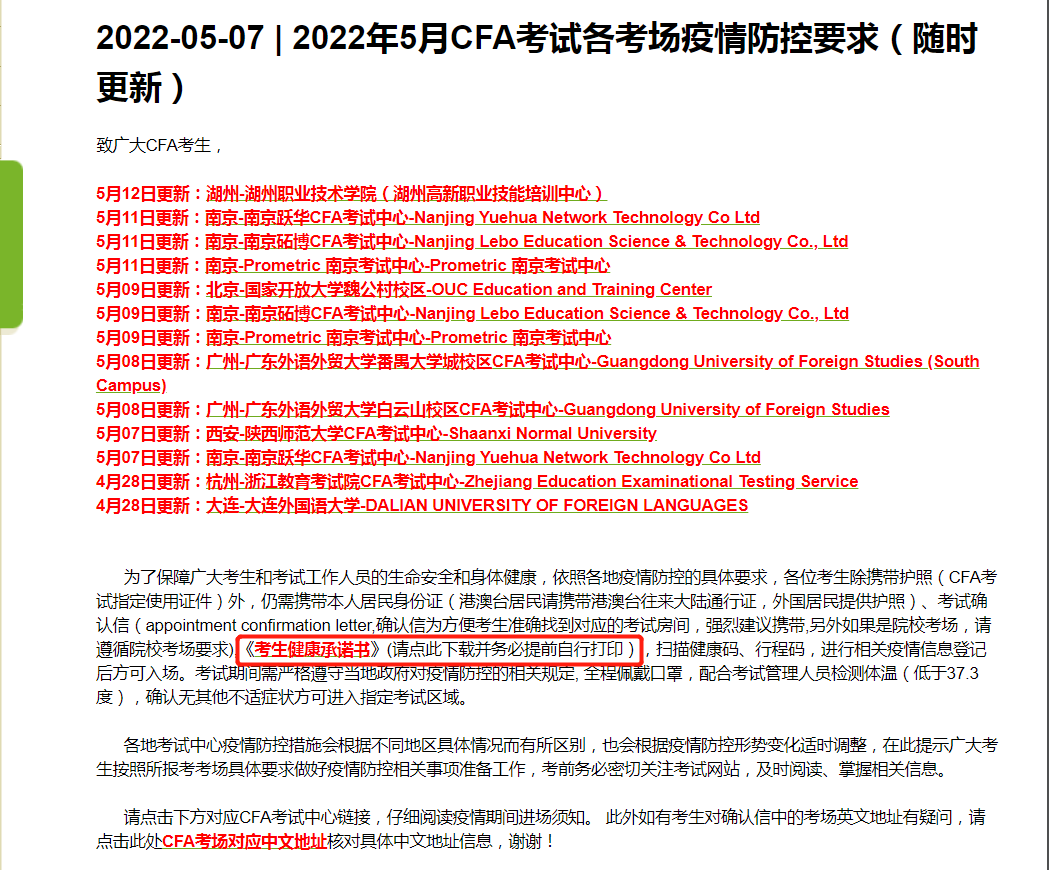 CFA報(bào)名考試協(xié)會(huì)也明確表示:根據(jù)各地疫情防控要求,考生需要在考試當(dāng)天攜帶有效身份證件、準(zhǔn)考信(選完考位后由Prometric發(fā)出的Confirmation Letter),掃描健康碼、行程碼,遵守當(dāng)?shù)卣畬?duì)需要進(jìn)行隔離的相關(guān)規(guī)定。下載:點(diǎn)擊下載 “考生健康承諾書(shū)”。