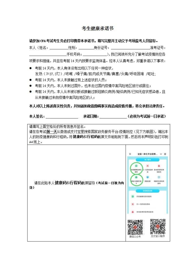 附上CFA考試健康承諾書(shū)樣式,考生可自行打印↓↓↓》》》點(diǎn)擊詳細(xì)了解CFA健康承諾書(shū)下載