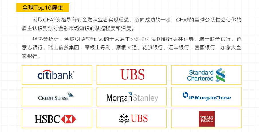 CFA持證人就業(yè)最多的世界著名機(jī)構(gòu)包括:高盛、摩根斯坦利、J.P摩根、花旗、穆迪、德意志銀行、巴克萊銀行、瑞士信貸和瑞銀、普華永道;國內(nèi)頭牌投行如中金、中信、銀河證券、國泰君安、廣發(fā)證券、華泰證券、光大證券、國信證券、中銀國際證券等。》》》點(diǎn)擊詳細(xì)了解2022年CFA持證人熱門就業(yè)崗位