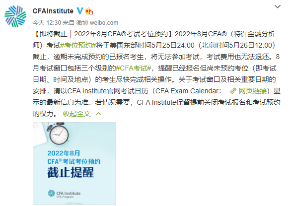 2022年8月CFA一級考位預(yù)約截止時間提醒:2022年5月25日晚23:59分(北京時間5月26日11:59截止)。
