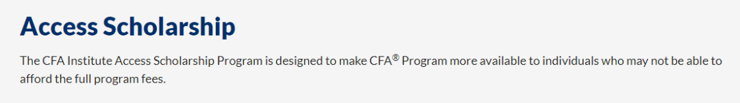 勵(lì)志獎(jiǎng)學(xué)金(Access Scholarship):針對無法負(fù)擔(dān)CFA項(xiàng)目費(fèi)用的個(gè)人,申請必須滿足所有CFA注冊條件。