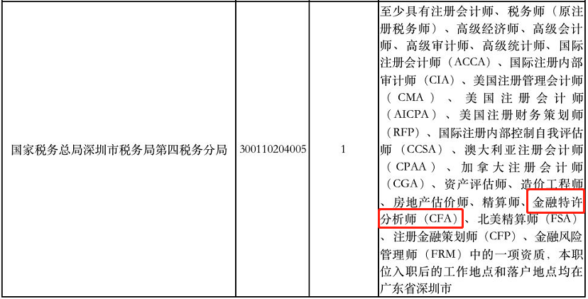 其中看到了《國家稅務總局深圳市稅務局補充錄用職位簡表》,發(fā)現(xiàn)其中不少都要求需要拿到CFA證書。