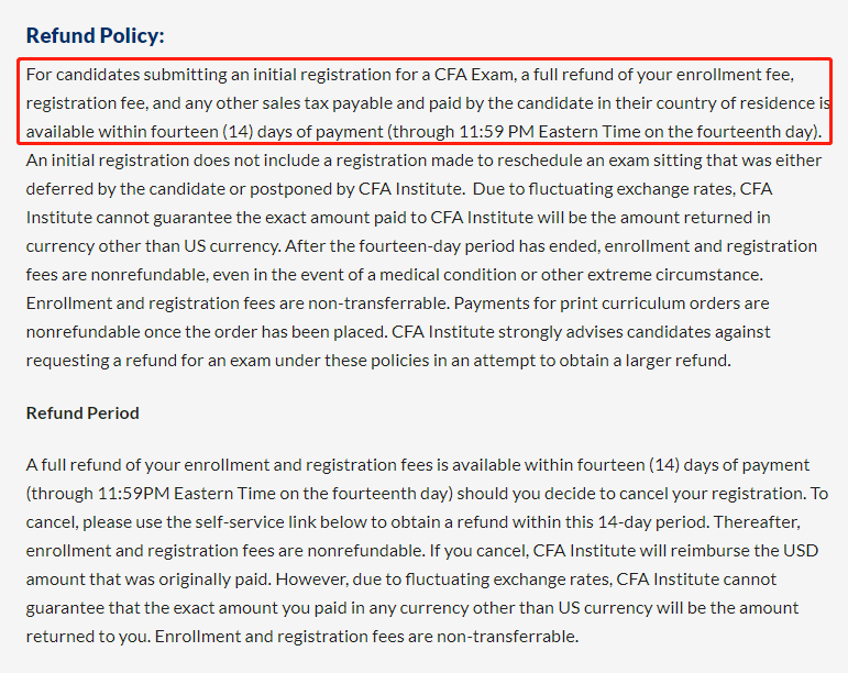 在初次注冊CFA并且報名考試的候選人,可以在付款后的14天內(nèi)申請全額退款注冊費和報名費,退款時間截止為(第14天美國東部時間晚11:59)。