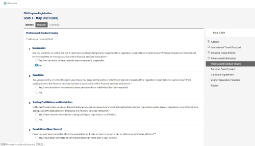 第15步,如果你沒有違反CFA協(xié)會調(diào)查的9項法律法規(guī)事項,全部選“NO”,進入下一步