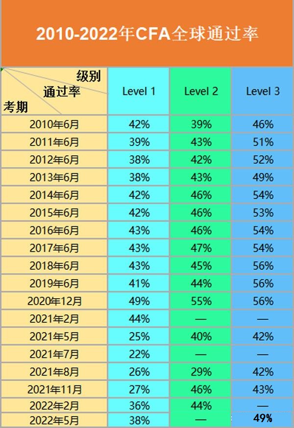 如果想要了解CFA一級考試的通過率,可以參考下面這張圖: