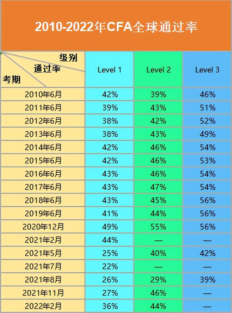 2010-2022年CFA考試的通過率:
