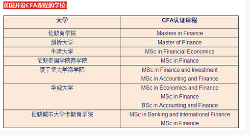 1、 本科階段只有蘭卡斯特大學(xué)和曼徹斯特大學(xué)開設(shè)CFA認(rèn)證課程。城市大學(xué)卡斯商學(xué)院有一個(gè)業(yè)余(Part time)課程,中國學(xué)生一般不會申請的。