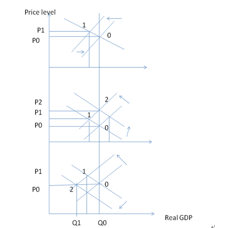 4、Cost push inflation shock由于生產(chǎn)資料的價(jià)格上升導(dǎo)致短期需求減少---上面圖形為fixed rule, 中間為維持GDP增長的feedback rule, 下面為維持價(jià)格水平的feedback rule----下面圖形的開始都是由于cost push inflation shock的出現(xiàn),短期需求曲線發(fā)生移動(dòng),導(dǎo)致SRAS曲線向左上方移動(dòng)而導(dǎo)致。