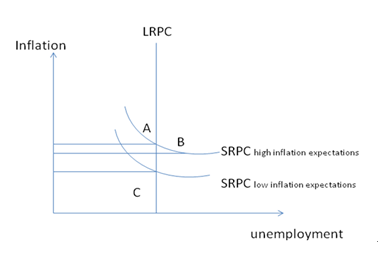 6、對(duì)12中的內(nèi)容結(jié)合飛利浦曲線進(jìn)行理解---如果央行的政策是creditable的,則通脹率直接從A點(diǎn)下降到C點(diǎn),并且保證了失業(yè)率不會(huì)升高;反之如果政策不是creditable的, 則導(dǎo)致通脹率從A點(diǎn)下降到B點(diǎn), 但是這個(gè)過程中導(dǎo)致了失業(yè)率升高!?。?--重要?。。?/p>