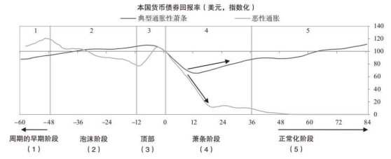 在惡性通脹期間,進行投資應遵循幾條基本原則:做空貨幣,盡可能把錢匯到國外,購買大宗商品,投資大宗商品行業(yè)(例如黃金、煤炭和金屬)。購買股票有利有弊,當通脹滑向惡性通脹時,投資股市是個賠錢的主意。股票價格和匯率之間的高度相關性消失,相反二者之間的差異越來越大。在此期間,黃金成為首選的投資資產,即使以本國貨幣計價的股票價格飆升,結果仍然是災難性的虧損,債券已經一錢不值。一旦通脹性去杠桿化演變成惡性通脹,貨幣作為價值儲存手段的地位便一去不復返。為結束通脹性去杠桿化,各國采取的典型辦法是發(fā)行具有堅實基礎的新貨幣,逐步淘汰舊貨幣。