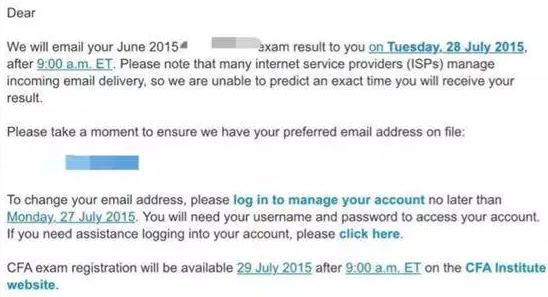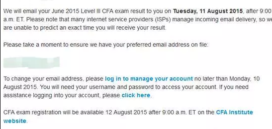 根據(jù)CFA協(xié)會官方給出的時間安排:June 2015 - Levels I and II: We will email your exam result on 28 July, after 9:00 a.m. ET, and they will be available online 29 July, after 9:00 a.m. ET. CFA協(xié)會將會在美國東部時間7月28日上午9點將考試成績發(fā)到各位CFA一二級考生的注冊郵箱;由于美國東部時間和北京時間相差12個小時的時差,因此中國地區(qū)CFA一二級考生將會在7月28日晚上9點收到來自CFA協(xié)會的成績郵件;CFA三級考生將在8月11日晚上9點收到CFA考試成績。