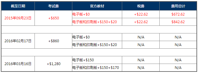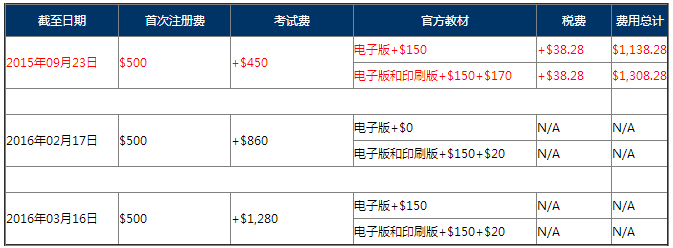 [注:]重考考生僅需支付考試費(fèi)和教材費(fèi)用,無(wú)需支付注冊(cè)費(fèi)。更多詳見(jiàn)=>2016年CFA報(bào)名重要信息(注意:1. 以上費(fèi)用均以“美元”為計(jì)算單位2. 以上報(bào)名時(shí)間以美國(guó)東部時(shí)間為準(zhǔn))*注:CFA官方教材費(fèi)用費(fèi)用明細(xì):