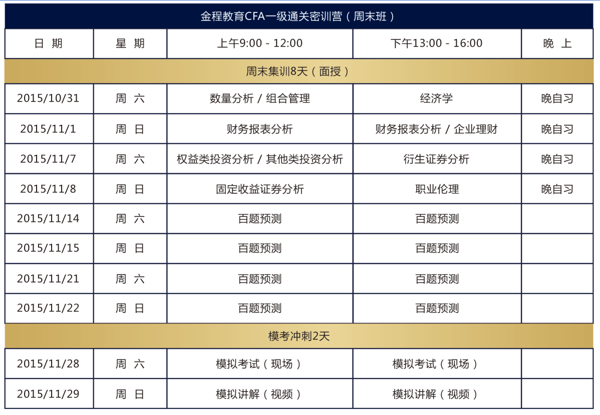備考時間是考試通過的保障,如何有效合理地利用CFA考前周末時間,將是你***考試的關鍵所在!據(jù)統(tǒng)計,離考試時間越近的CFA真題訓練,內容就越接近CFA考試“真相”,考前“沖刺密訓營”,助您百分百***CFA!