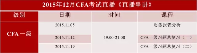 CFA沖刺:時(shí)間緊!資料多!難度大! OMG!還有那些沒看完的notes、面對(duì)滿目的英文和公式... 金程CFA特準(zhǔn)備,CFA一級(jí)重要科目“財(cái)務(wù)報(bào)表分析”直播和“CFA習(xí)題總復(fù)習(xí)”直播,特別適合12月沖刺考生和2016年一級(jí)考生。