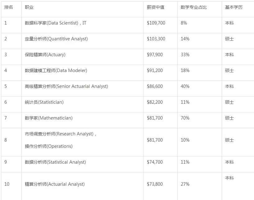 來(lái)自PayScale的官方薪資報(bào)告數(shù)據(jù)顯示,數(shù)學(xué)專業(yè)畢業(yè)生的薪資中值在70900美元——相比之下,其他專業(yè)畢業(yè)生的薪資中值僅為58600美元。而某些職業(yè),如數(shù)據(jù)科學(xué)家和定量分析師,其工資中值甚至可以高達(dá)10萬(wàn)美元以上。