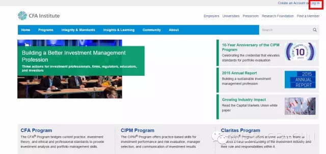 第一步:登錄CFA協(xié)會官網(wǎng)www.cfainstitute.org,已經(jīng)注冊報名的CFA考生只需點擊 Log In(登錄)