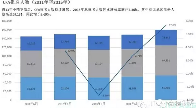 據(jù)CFA Institute報(bào)道,15萬(wàn)9千人注冊(cè)了2015年6月的CFA一、二、和三級(jí)的考試。注冊(cè)人數(shù)同比增長(zhǎng)7.36%。其中亞太地區(qū)的注冊(cè)人數(shù)更是同比增加了9.69%:高達(dá)6萬(wàn)9千人。美洲考生增長(zhǎng)率只有4.75%,到達(dá)5萬(wàn)5千人。