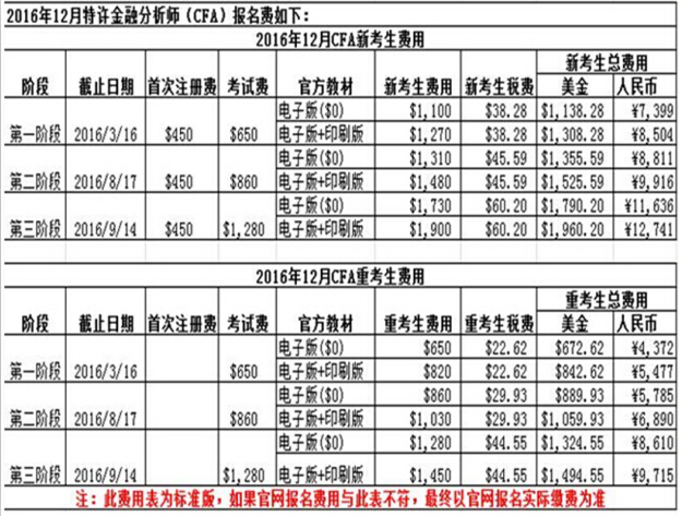 美國CFA協(xié)會(huì)依舊實(shí)行越早報(bào)名費(fèi)用越低的政策,第一個(gè)報(bào)名階段費(fèi)用,第二第三階段考試報(bào)名費(fèi)用依次增加,2016年12月CFA考試報(bào)名第二階段截止8月17日。