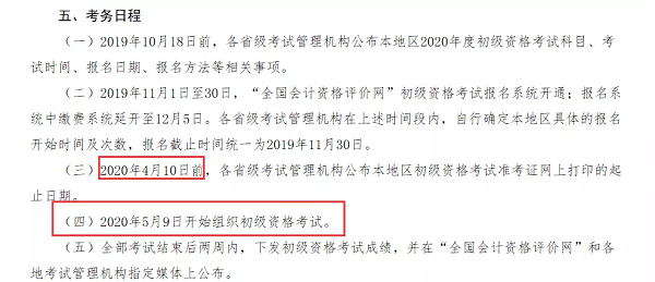 如2020年考務(wù)公告中的規(guī)定:“2020年初級會計職稱考試原定于5月9日開始考試,2020年4月10日前,各省級考試管理機構(gòu)公布本地區(qū)初級資格考試準(zhǔn)考證網(wǎng)上打印的起止日期。” 公布準(zhǔn)考證打印日期正好為考前一個月。