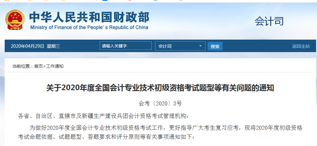 關(guān)于2020年度全國會(huì)計(jì)專業(yè)技術(shù)初級(jí)資格考試題型等有關(guān)問題的通知